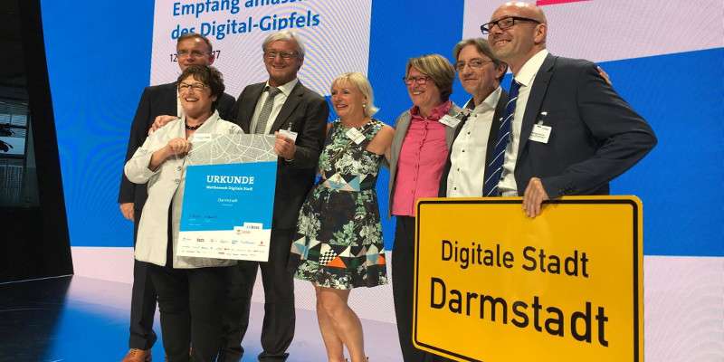 OB Jochen Partsch hat von Bundeswirtschaftsministerin Brigitte Zypries die Urkunde für den Gewinn des Bitkom-Wettbewerbs Digitale Stadt überreicht bekommen. (Quelle: Wissenschaftsstadt Darmstadt) Digitalisierung der Stadt: Darmstadt hat den bundesweiten Wettbewerb "Digitale Stadt" gewonnen. Die südhessische Stadt wird mit Hilfe von mehr als 20 Partnerunternehmen zu einer digitalen Modellstadt ausgebaut, wie der Digitalverband Bitkom am Montag in Berlin mitteilte. Ab 2018 werden demnach der Verkehr, die Energieversorgung, Schulen und das Gesundheitswesen mit neuen Technologien ausgestattet.