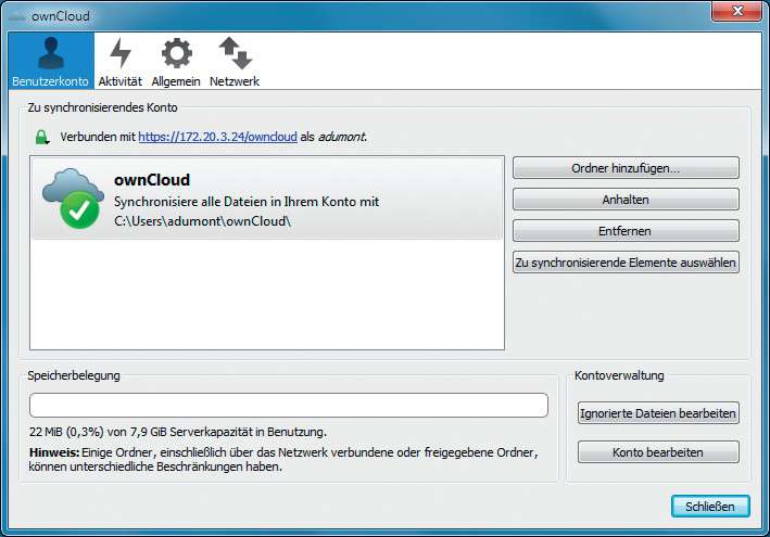 ownCloud: Der Client funktioniert ähnlich wie Dropbox, Google Drive und OneDrive. Viele deutsche Firmen sträuben sich dagegen, ihre Daten einem Cloud-Anbieter anzuvertrauen.